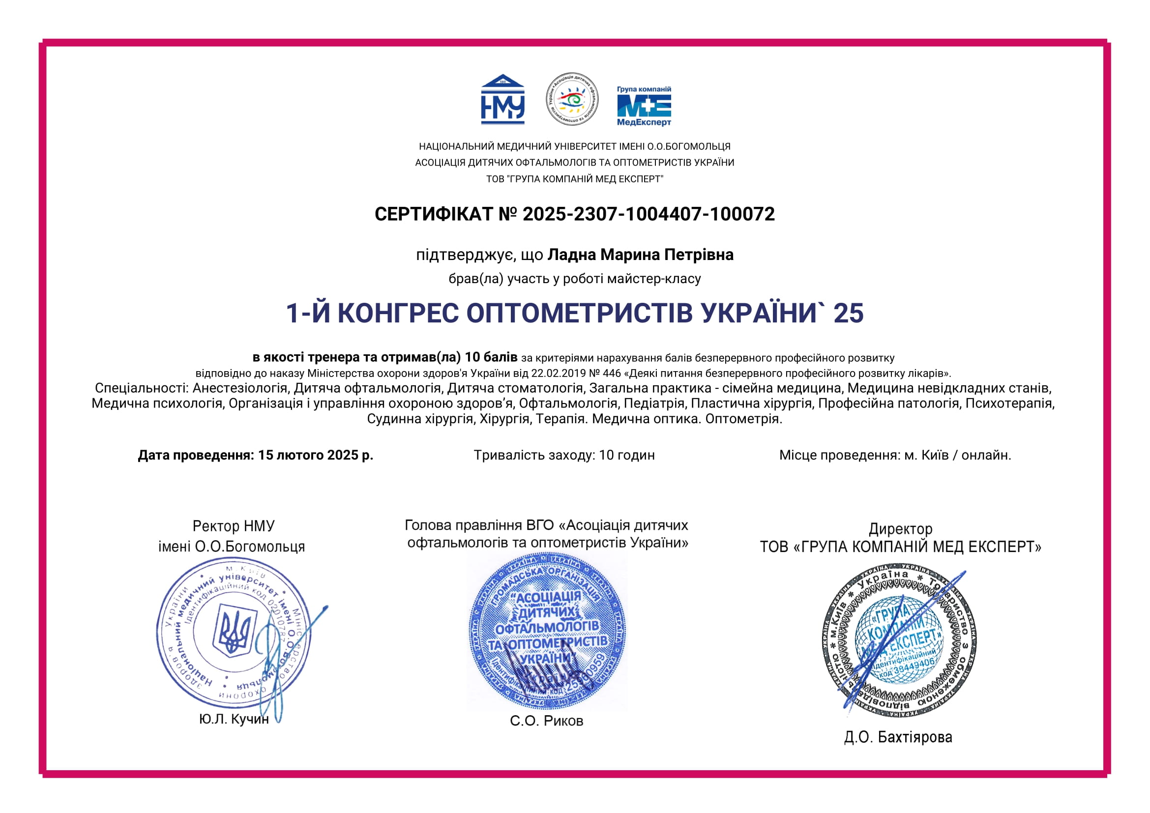 Ладна Марина Петрівна - оптометрист, офтальмологСпеціалізація: оптометрист, спеціаліст по діагностиці синдрому сухого ока